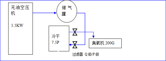 氣源二:7.5KW空壓機(jī),7.5P冷干機(jī),兩組過濾器,0.6m3儲(chǔ)氣罐。TeV臭氧發(fā)生器_臭氧消毒機(jī)_臭氧水機(jī)_制氧機(jī)_廣州佳環(huán)電器【官網(wǎng)】