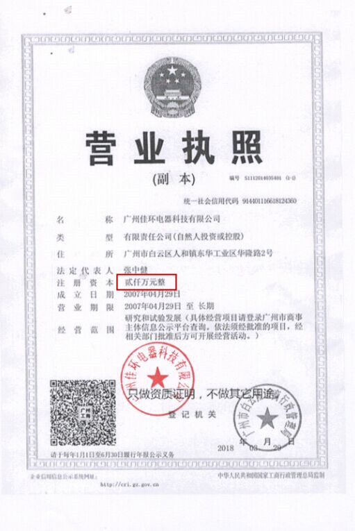 為了公司的發展,廣州佳環電器科技有限公司由原來的注冊資金30萬元正式更改為 2000萬元整。cFu臭氧發生器_臭氧消毒機_臭氧水機_制氧機_廣州佳環電器【官網】